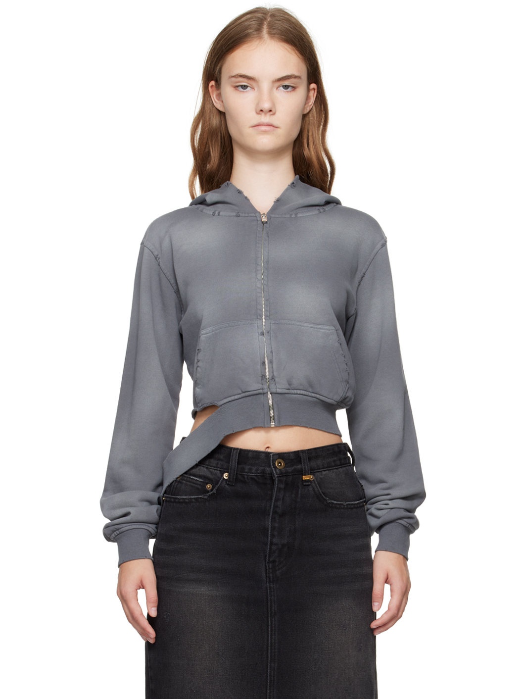 French terry hoodie. Distressing throughout. · Zip closure · Patch pockets · Cutout at rib knit raw edge hem · Rib knit cuffs · Logo embroidered at back · Logo-engraved silver-tone hardware Supplier color: Charcoal Body: 100% cotton. Trim: 95% cotton, 5% polyurethane. Made in South Korea 242327F097013