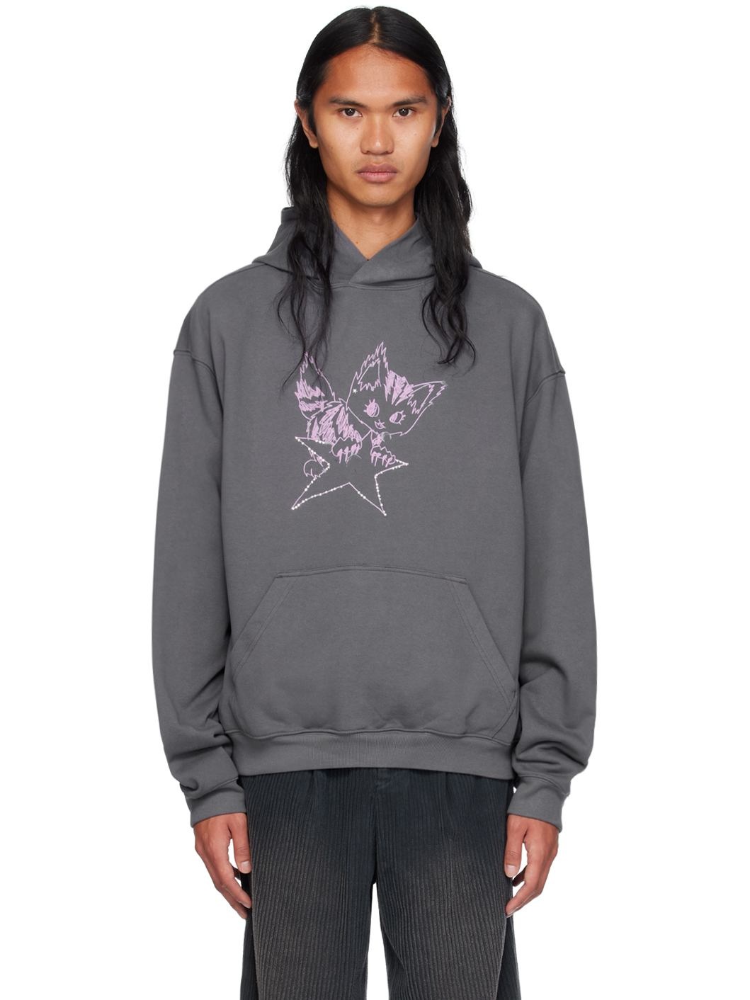 French terry hoodie. · Graphic with crystal-cut embellishments at front · Kangaroo pocket · Rib knit hem and cuffs · Dropped shoulders · Logo embroidered at back hem Supplier color: Charcoal 100% cotton. Made in South Korea 242327M202001