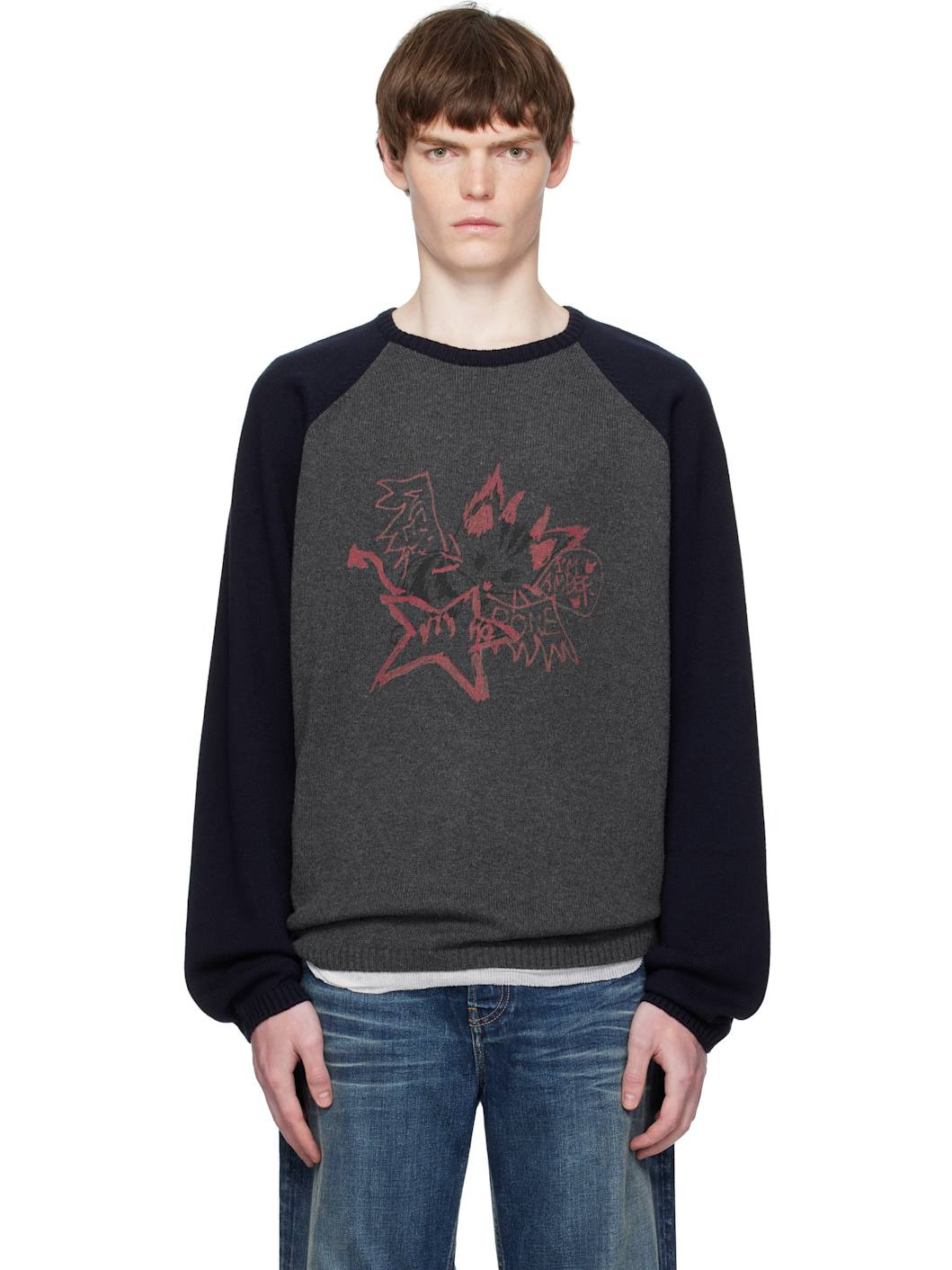 Knit wool- and cotton-blend sweater. · Rib-knit crewneck, hem, and cuffs · Logo graphic printed at front · Raglan sleeves Supplier color: Charcoal 55% wool, 45% cotton. Made in South Korea 252327M201001
