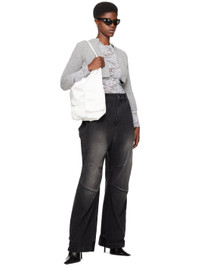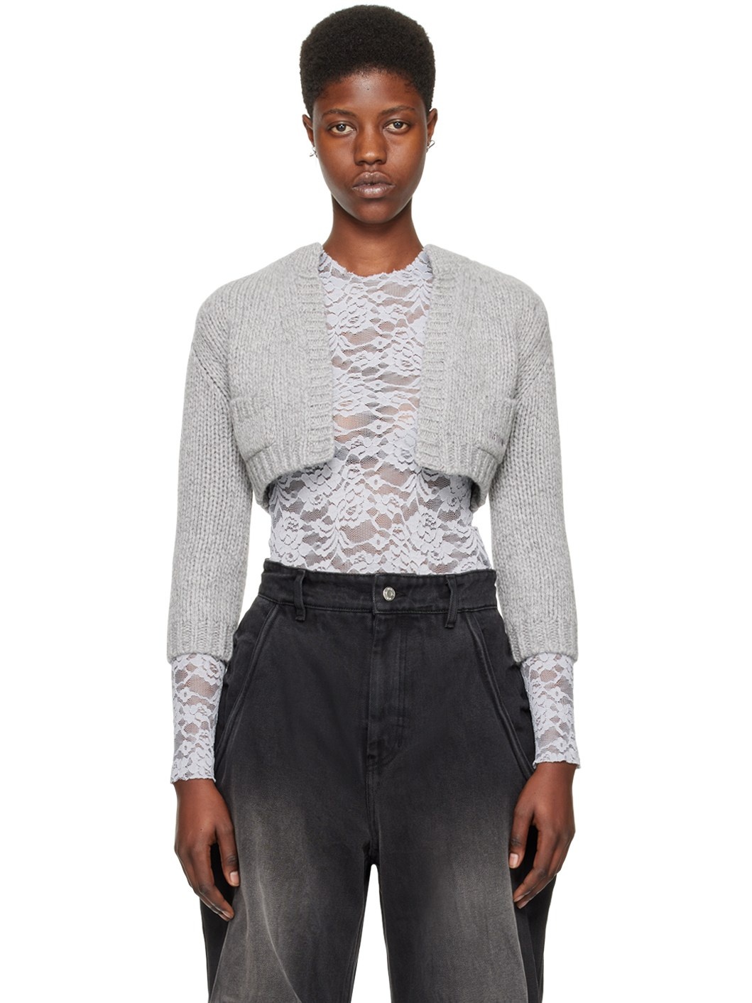 Knit wool- and alpaca-blend cardigan. · Rib knit crewneck, open front, hem, and cuffs · Patch pockets · Logo embroidered at front hem Supplier color: Gray 78% wool, 15% alpaca, 7% nylon. Made in South Korea 241327F095001