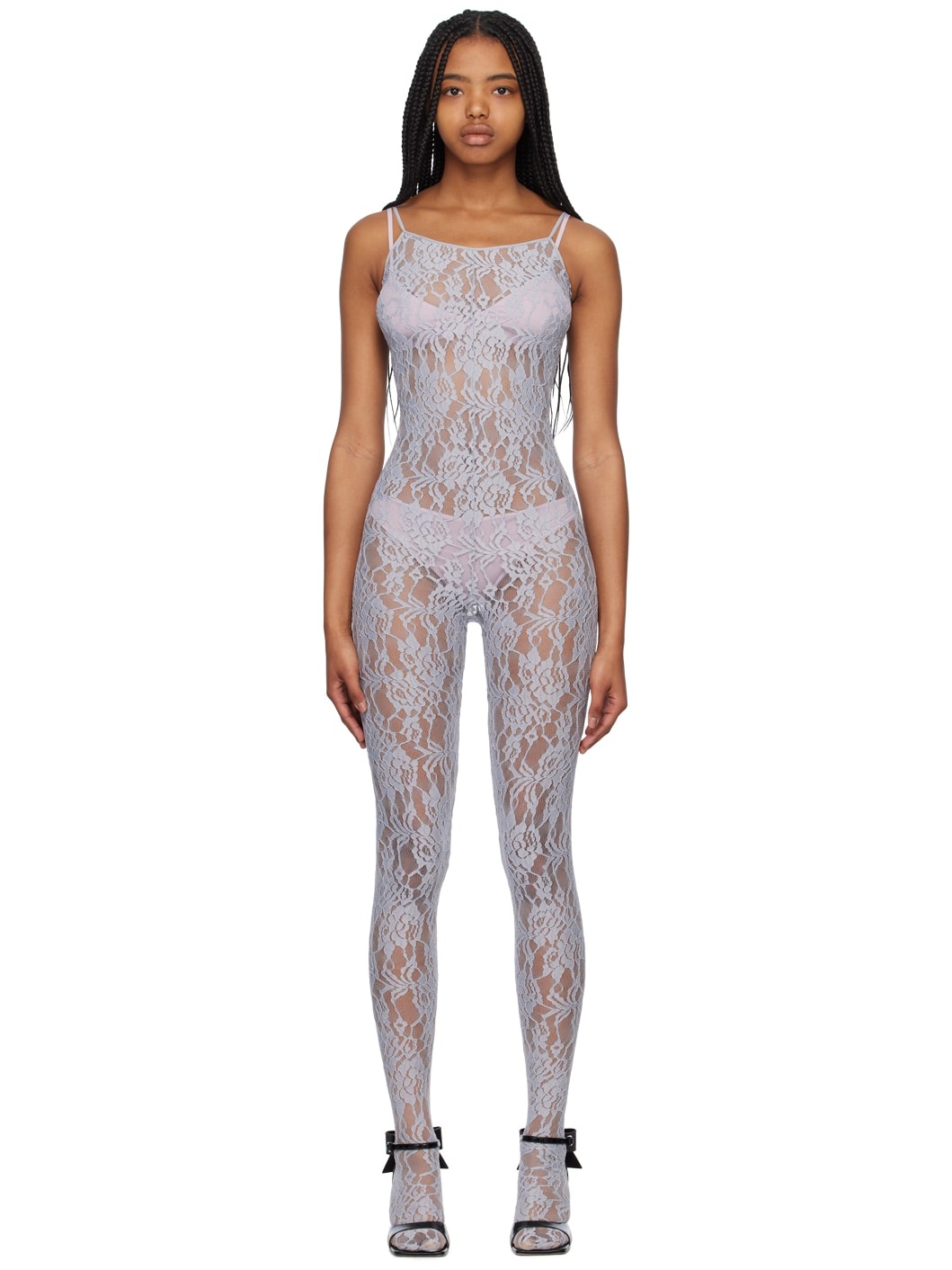 Semi-sheer knit stretch nylon jumpsuit. Jacquard floral pattern throughout. · Scoop neck · Integrated feet · Fixed spaghetti shoulder straps · Low back Supplier color: Grey
