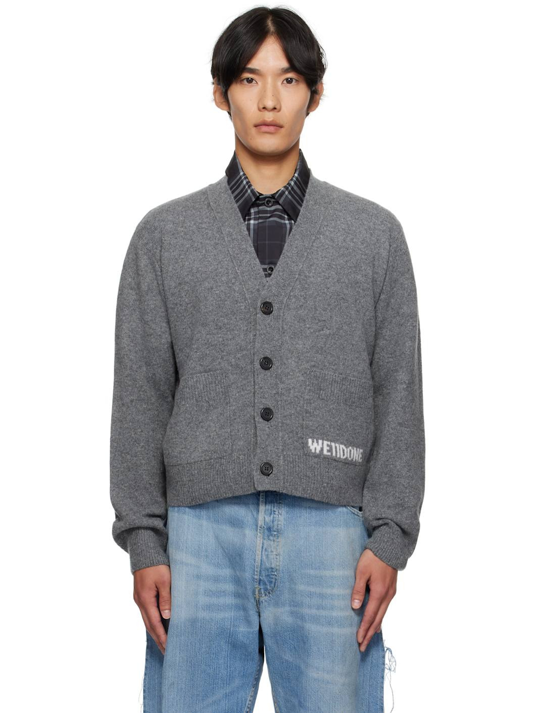 Knit wool-blend cardigan. · Rib-knit Y-neck, hem, and cuffs · Button closure · Patch pockets and jacquard logo at front Supplier color: Charcoal 80% wool, 20% nylon. Made in South Korea 252327M200003