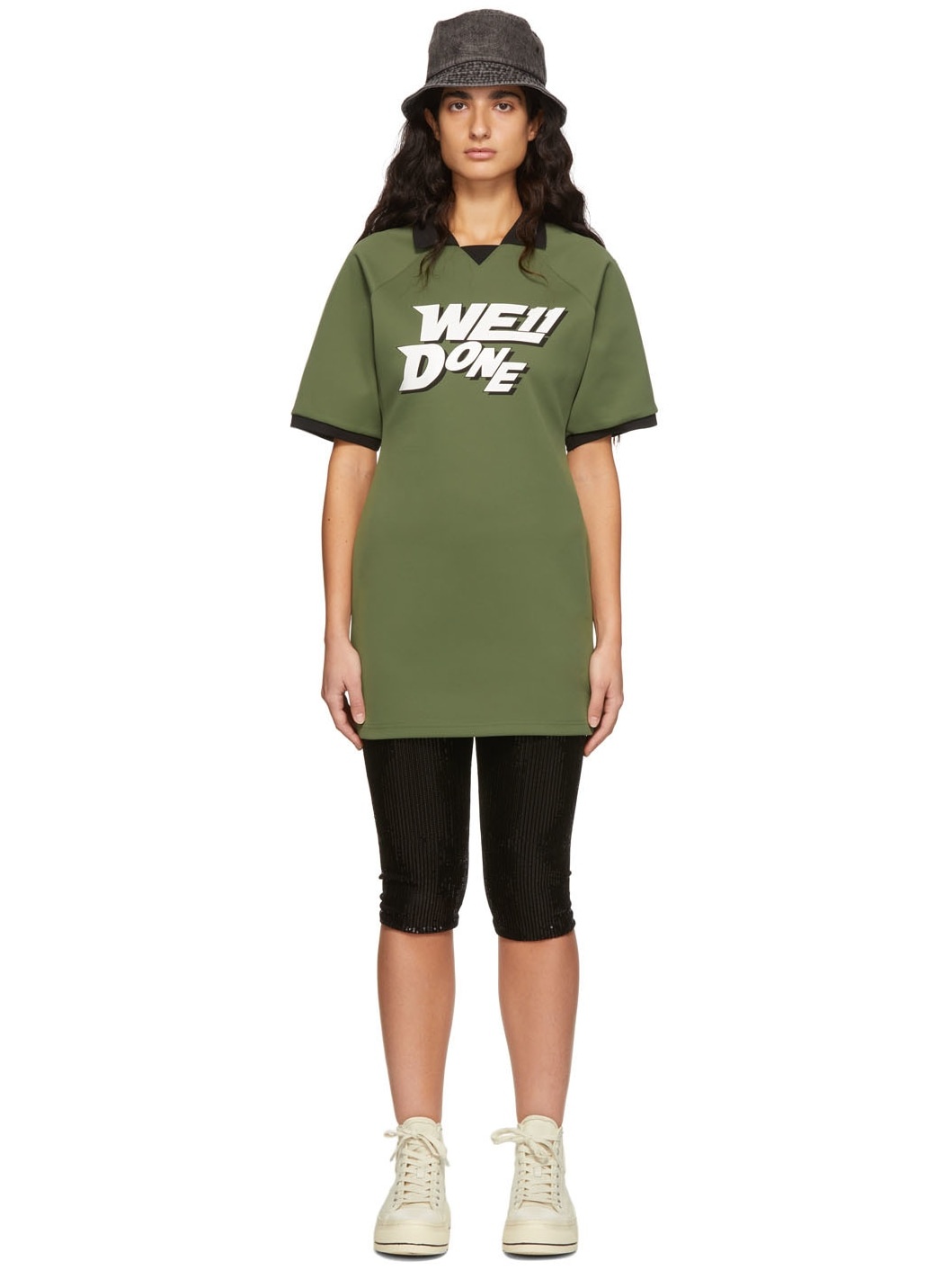 Stretch knit polyester dress. · Raglan sleeves · Printed logo · Rubberized logo patch at back · Darts at back · Rib knit spread collar and cuffs Supplier color: Khaki Body: 100% polyester. Trim: 94% polyester, 6% polyurethane. Made in South Korea 221327F052007
