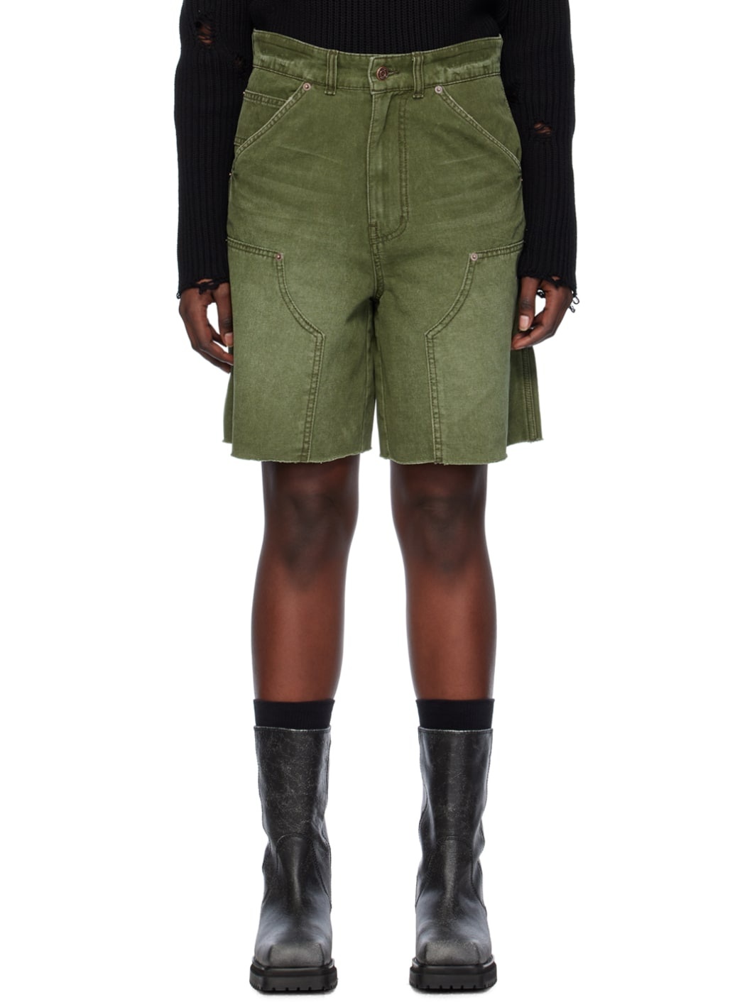 Cotton canvas shorts. Fading and whiskering throughout. · Paneled construction · Belt loops · Five-pocket styling · Zip-fly · Raw edge at cuffs · Patch pocket at outseam · Hammer loop at outseam · Logo embroidered at back Supplier color: Khaki 100% cotton. Made in South Korea 241327F088005