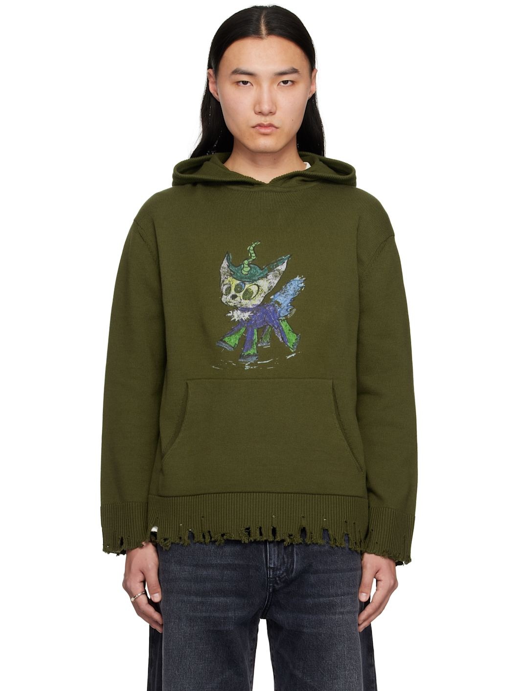 Knit cotton hoodie. · Rib-knit edge at hood, hem, and cuffs · Graphic printed at front · Kangaroo pocket · Distressing at hem and cuffs · Dropped shoulders Supplier color: Khaki 100% cotton. Made in South Korea 251327M202007