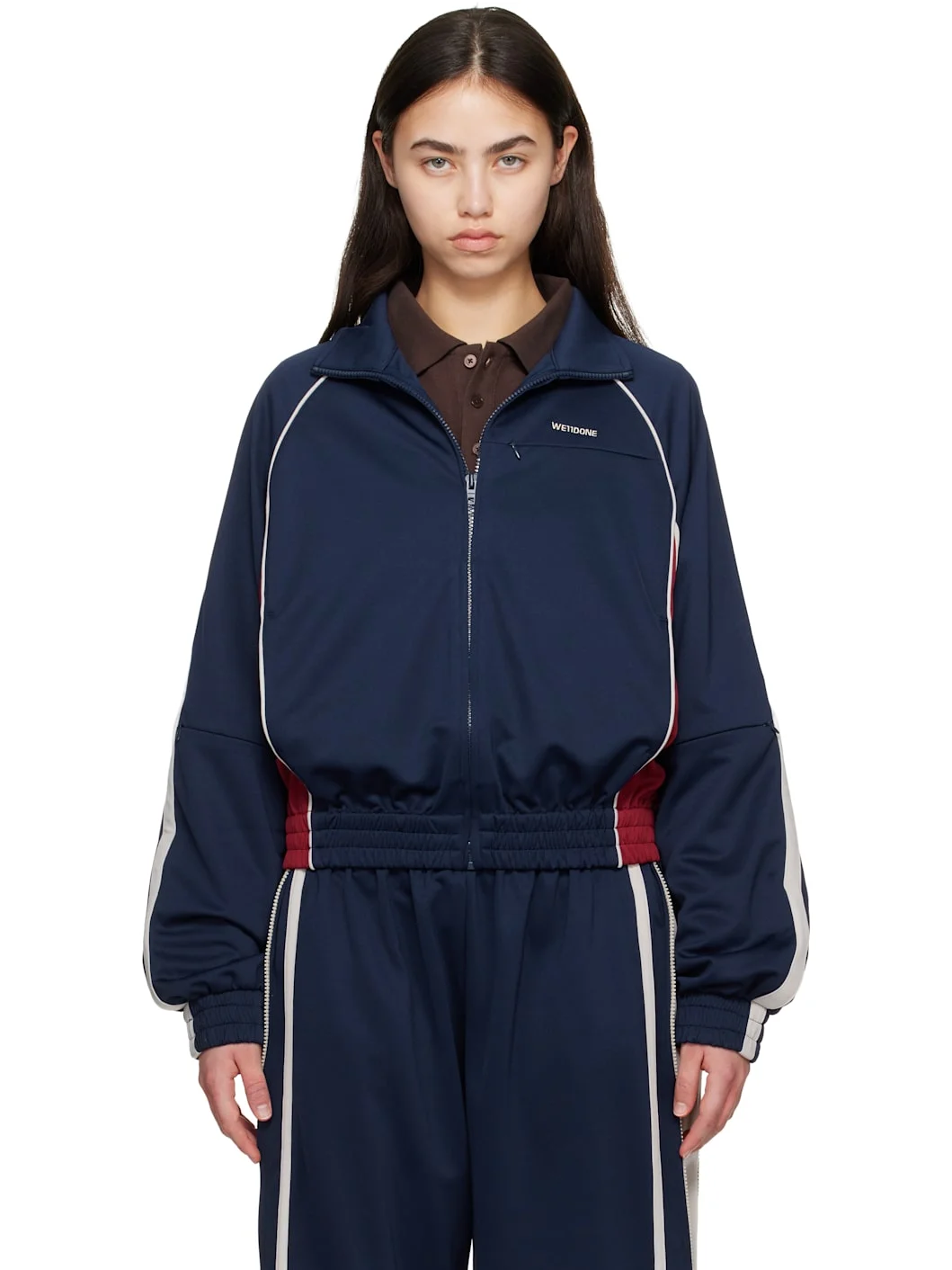 Jersey track jacket. · Piping and colorblocking throughout · Stand collar · Zip closure · Embroidered logo and zip pocket at chest · Welt pockets at front · Elasticized hem and cuffs · Embroidered eyelets at armscyes · Zip vent at raglan sleeves · Unlined Supplier color: Navy Body: 100% polyester. Trim: 48% polyester, 47% cotton, 5% polyurethane. Made in South Korea 252327F063009