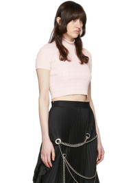 Rib knit rayon-blend turtleneck. Raised jacquard graphic pattern throughout. · Rolled edge at rib knit turtleneck collar · Logo plaque at front hem Supplier color: Pink 60% rayon, 30% polyester, 10% polyamide. Made in South Korea 221327F099005
