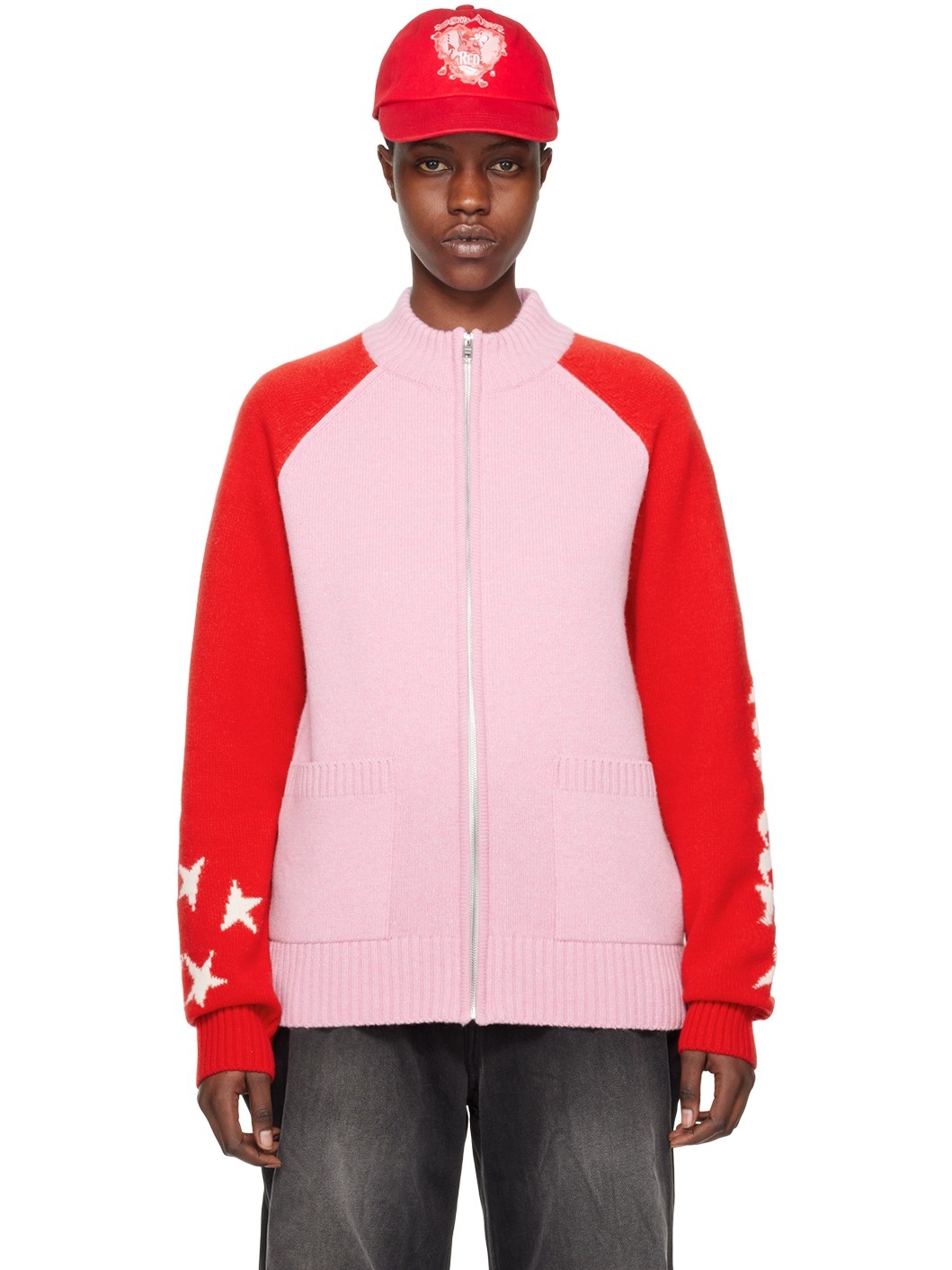 Knit wool jacket. · Rib knit mock neck, hem, and cuffs · Zip closure · Patch pockets · Raglan sleeves · Intarsia logo at sleeve · Intarsia graphics at sleeves Supplier color: Light pink 100% wool. Made in South Korea 241327F063001