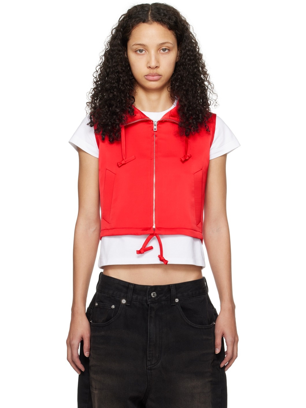 Polyester satin vest. · Drawstring at hood and droptail hem · Zip closure · Welt pockets Supplier color: Red 100% polyester. Made in South Korea 241327F097003