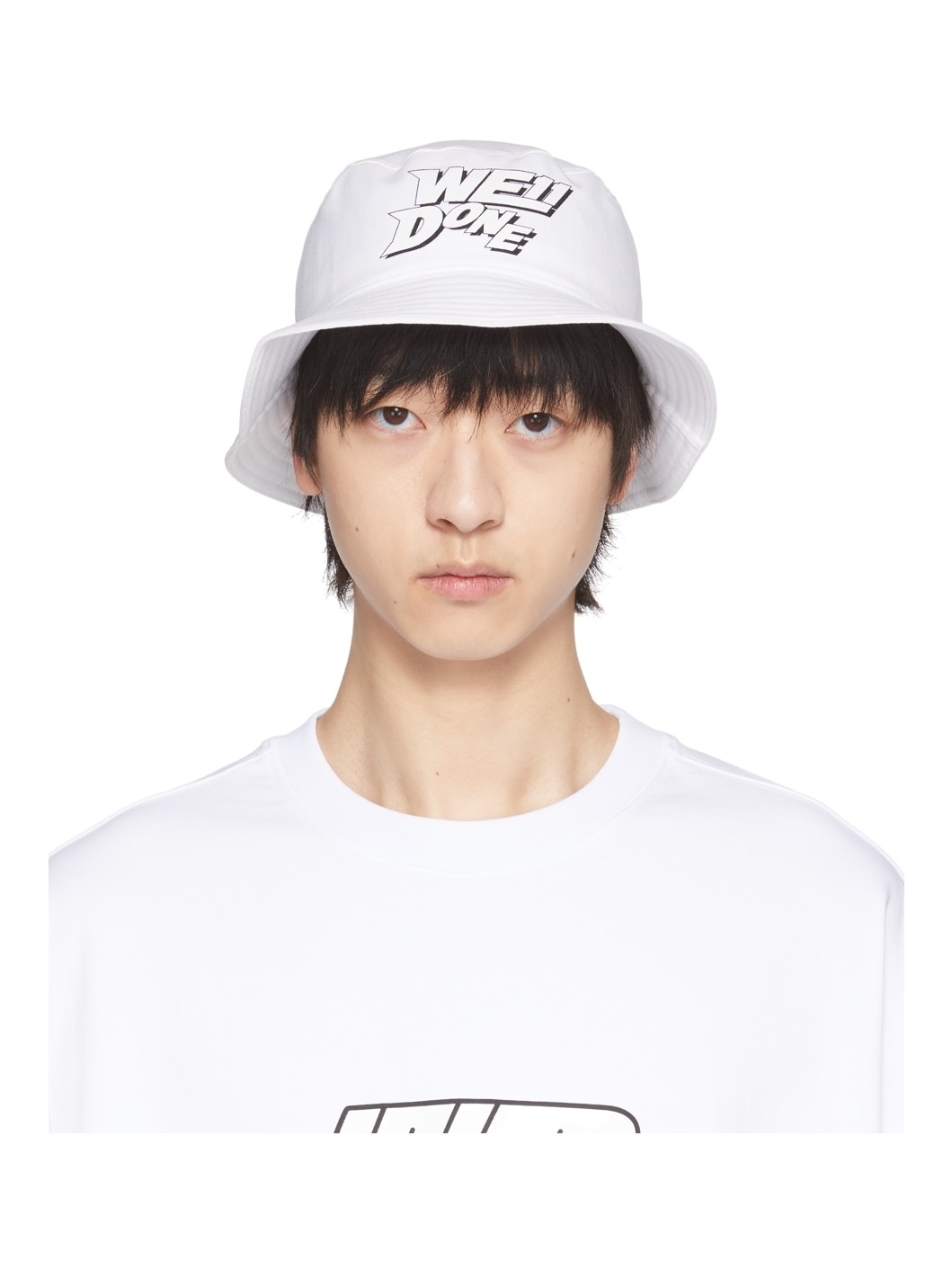 Twill bucket hat in white. Logo bonded in black and white at face. · Quilted brim · Satin lining Supplier color: White 68% polyester, 29% rayon. 3% polyurethane. Made in South Korea 221327M140005