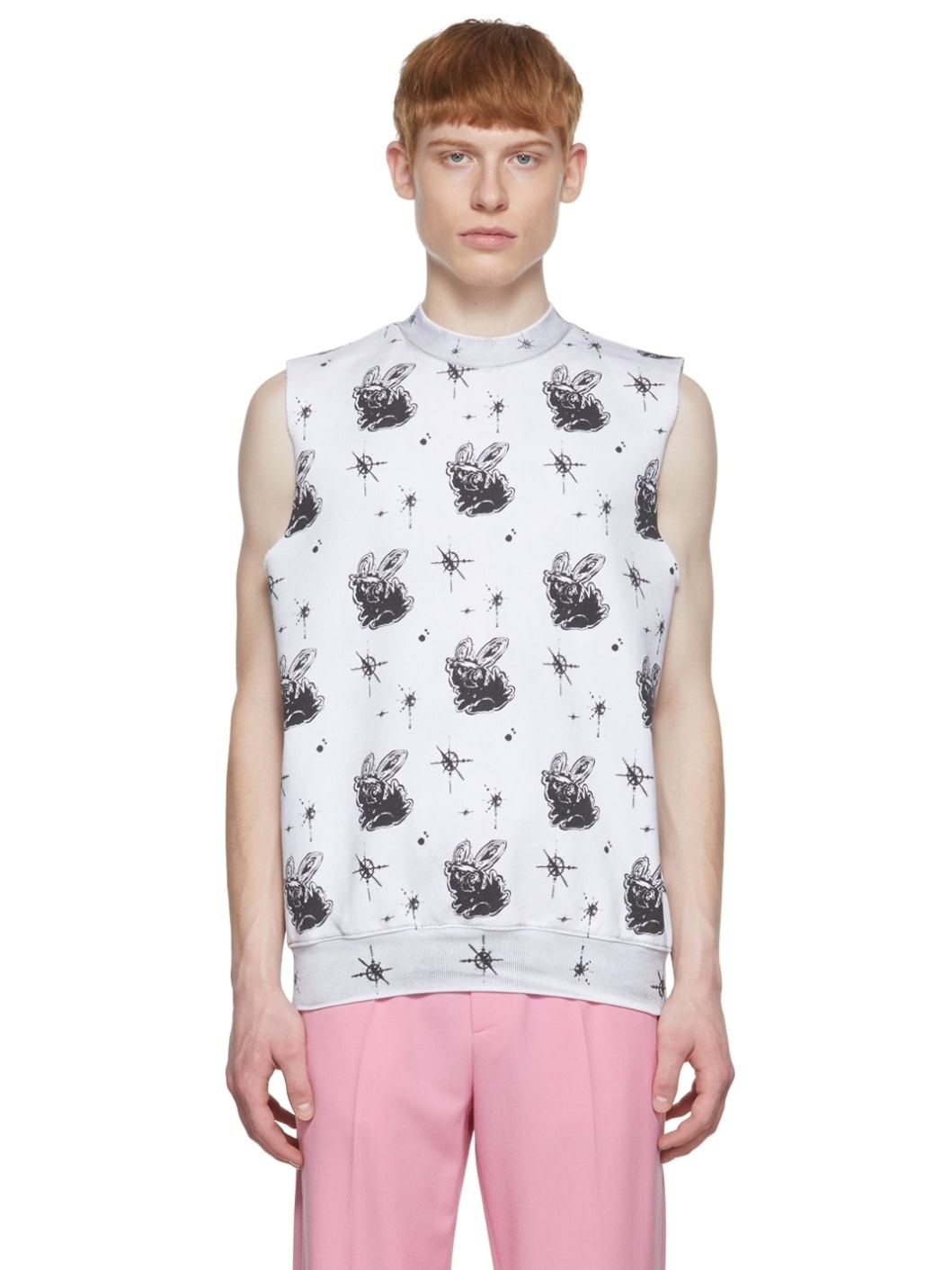 French terry vest. Fading and graphic pattern printed throughout. · Raw edge at armscyes · Rib knit crewneck and hem Supplier color: White Body: 100% cotton. Trim: 96% cotton, 4% polyurethane. Made in South Korea 221327M185017