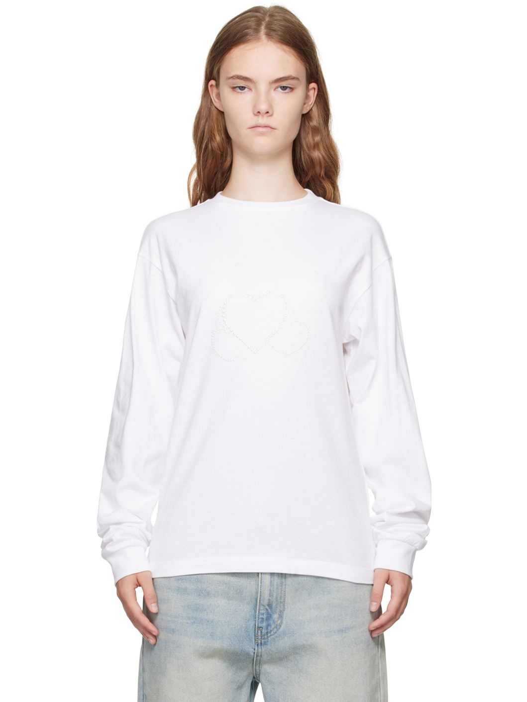 Cotton jersey T-shirt. · Rib knit crewneck and cuffs · Faux-pearl graphic at front · Dropped shoulders · Logo embroidered at back hem Supplier color: White 100% cotton. Made in South Korea 242327F110015