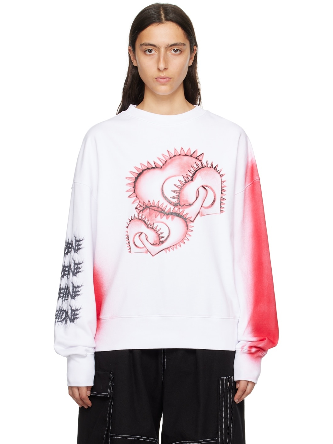 French Terry sweatshirt. Spray paint effect throughout. · Rib knit crewneck, hem, and cuffs · Graphic printed at front · Logo graphic at sleeve Supplier color: White 100% cotton. Made in South Korea 232327F098006