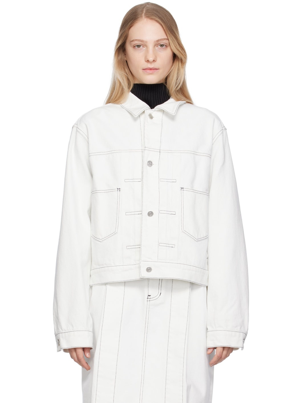 Non-stretch denim jacket. · Spread collar · Button closure · Tucks and patch pockets at front · Button fastening at vented cuffs · Button tabs at back hem · Contrast stitching in black Supplier color: Ice 100% cotton. Made in South Korea 232327F060000