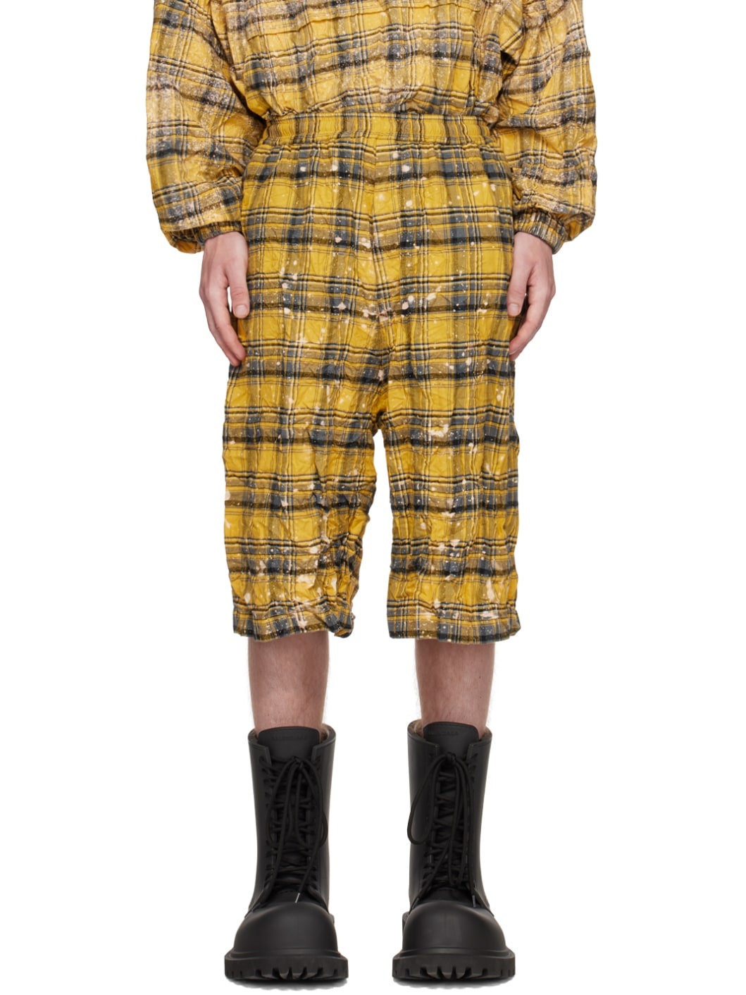 Crinkled cotton flannel shorts. Check pattern and paint splatter effect throughout. · Concealed drawstring at elasticized waistband · Four-pocket styling · Mock-fly Supplier color: Yellow 100% cotton. Made in South Korea 231327M193006
