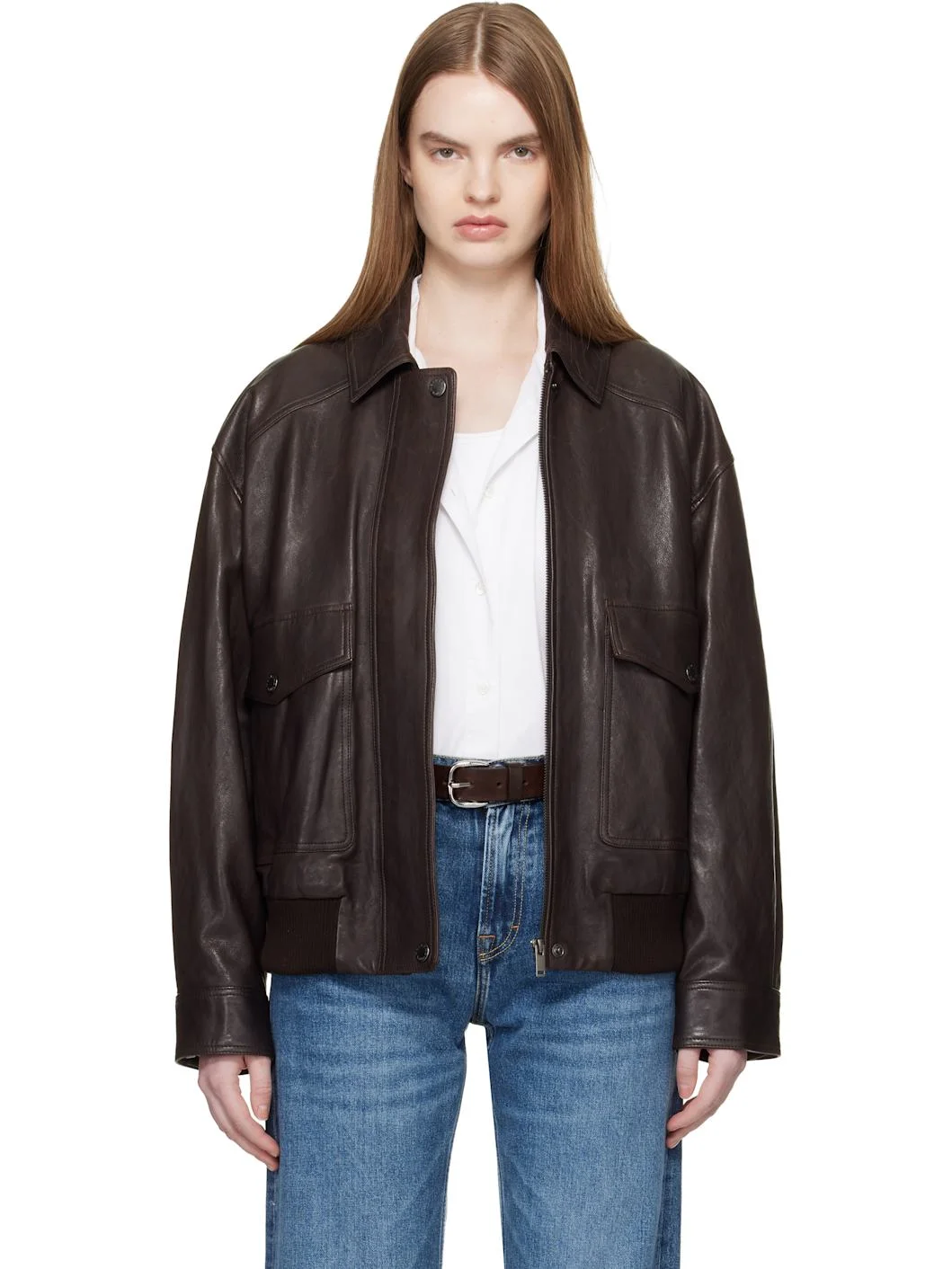 Grained lambskin jacket. · Spread collar · Zip closure with press-stud placket · Flap and welt pockets at front · Rib-knit hem · Adjustable press-stud barrel cuffs · Full satin lining Supplier color: Brown Body: 100% lambskin. Trim: 97% polyester, 3% elastane. Lining: 100% polyester. Made in India 261183F064002