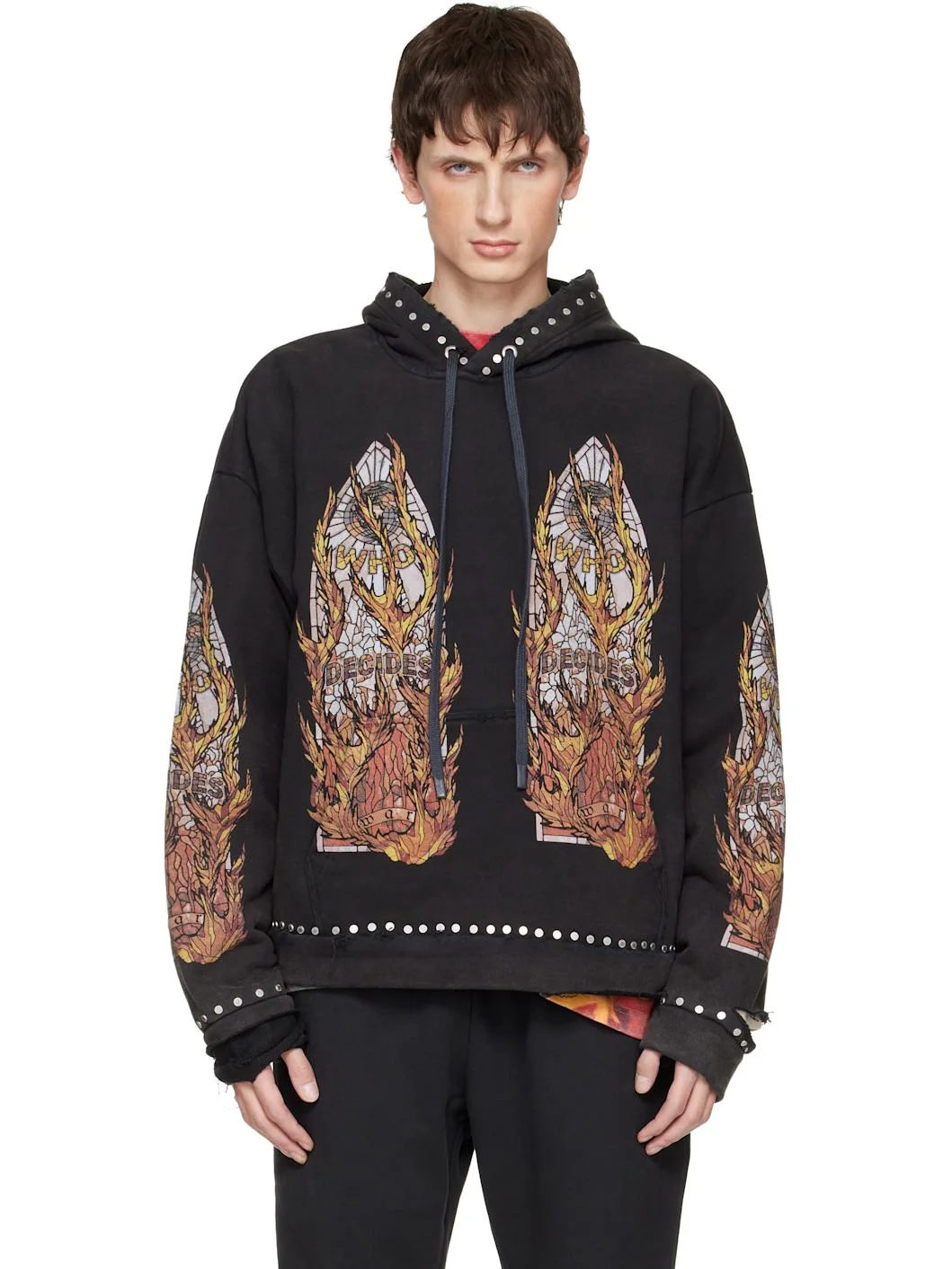 French terry hoodie. · Fading, distressing, and printed graphics throughout · Studs at hood, hem and cuffs · Drawstring at hood · Kangaroo pocket at front · Dropped shoulders · Logo-engraved silver-tone hardware Supplier color: Coal 100% cotton. Made in Turkey 252389M202034