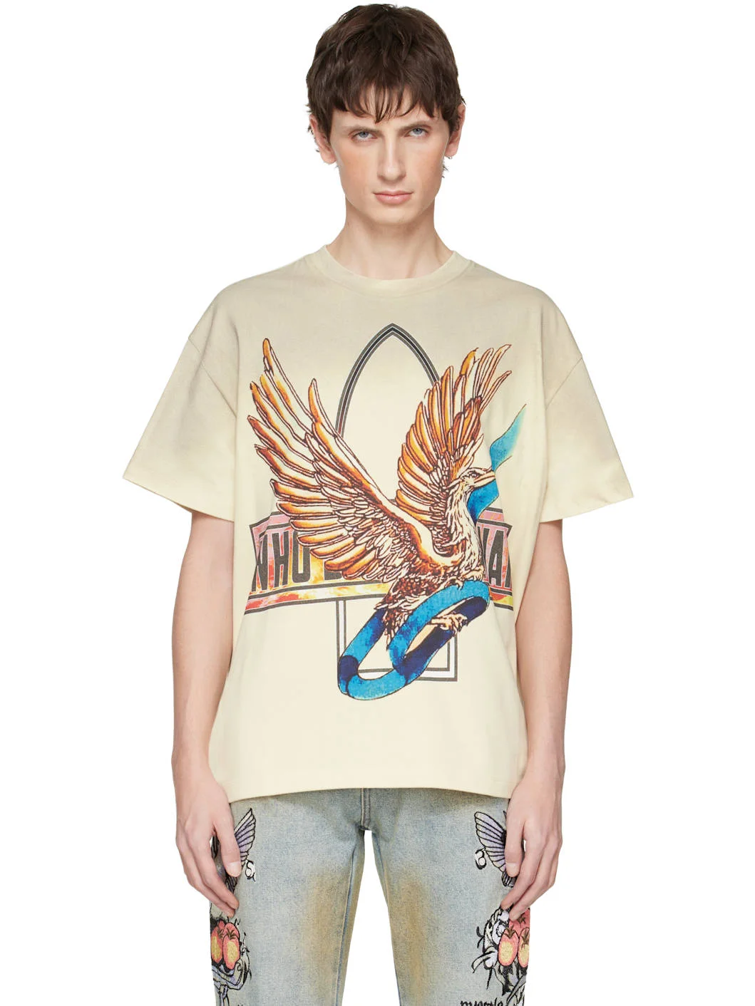 Cotton jersey T-shirt. · Fading throughout · Rib-knit crewneck · Logo graphic printed at front and back · Cropped hem Supplier color: Ivory 100% cotton. Made in Turkey 252389M213056