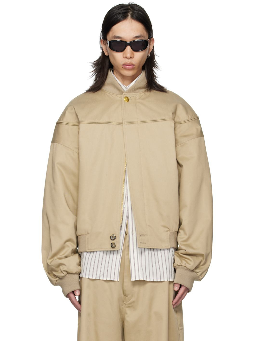 Cotton-blend gabardine bomber jacket. · Rib-knit stand collar, hem, and cuffs · Concealed zip closure and press-stud placket · Piping at front and back yoke · Welt and zip pockets at waist · Dropped shoulders · Welt pockets at interior · Full quilted satin lining Supplier color: Travertine Body: 65% polyester, 35% cotton. Lining 1: 100% cotton. Lining 2: 100% viscose. Made in Italy 252232M175009