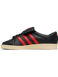 Low-top buffed leather sneakers. · Textured rubber trim at toe · Lace-up closure · Logo patch at extended foldover tongue · Padded collar · Signature serrated stripes and perforations at sides · Text embossed at outer side · Logo embossed at heel tab · Buffed leather lining · Treaded rubber sole Part of the Willy Chavarria x adidas Originals collaboration. Supplier color: Black/Red Upper: leather. Sole: rubber. Made in Indonesia 252232M237002