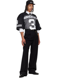 Polyester mesh T-shirt. · Paneled construction · Rib-knit V-neck · Text appliques at front, sleeves, and back · Dropped shoulders · Stripe appliques at sleeves · Embroidered logo patch at back collar Supplier color: Black 100% polyester. Made in United States 251232M213170