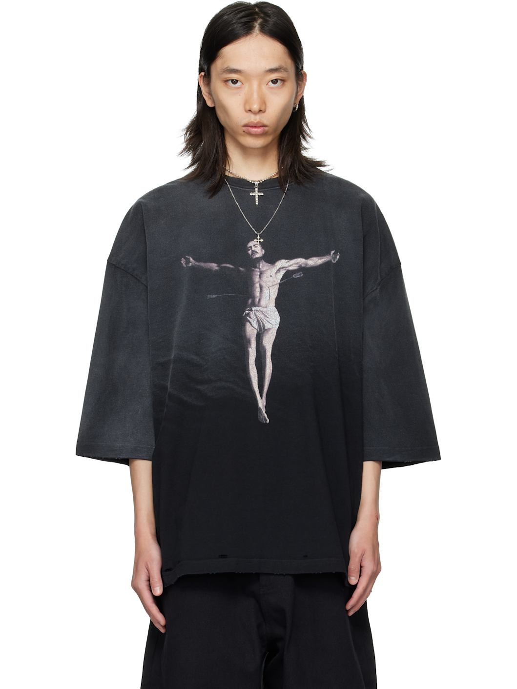 Cotton jersey T-shirt. · Fading and subtle distressing throughout · Rib-knit crewneck · Graphic printed at front · Dropped shoulders · Text printed at back Supplier color: Black 100% cotton. Made in United States 252232M213193