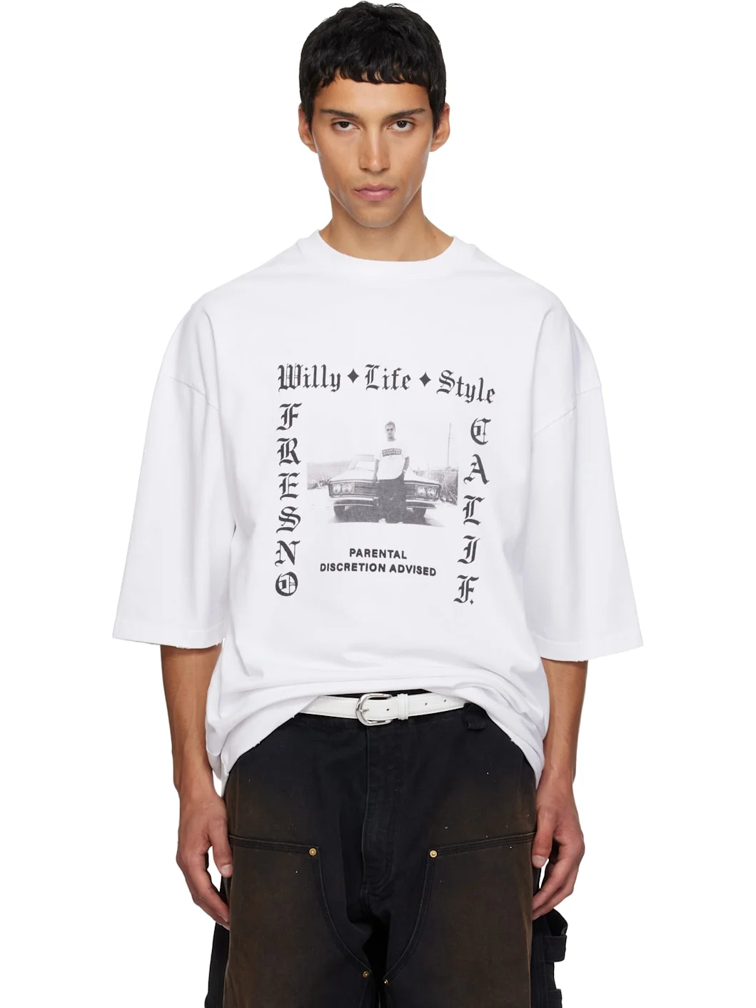 Oversized cotton jersey T-shirt. · Subtle distressing throughout · Rib-knit crewneck · Graphic and text printed at front · Dropped shoulders Supplier color: White 100% cotton. Made in United States 252232M213185