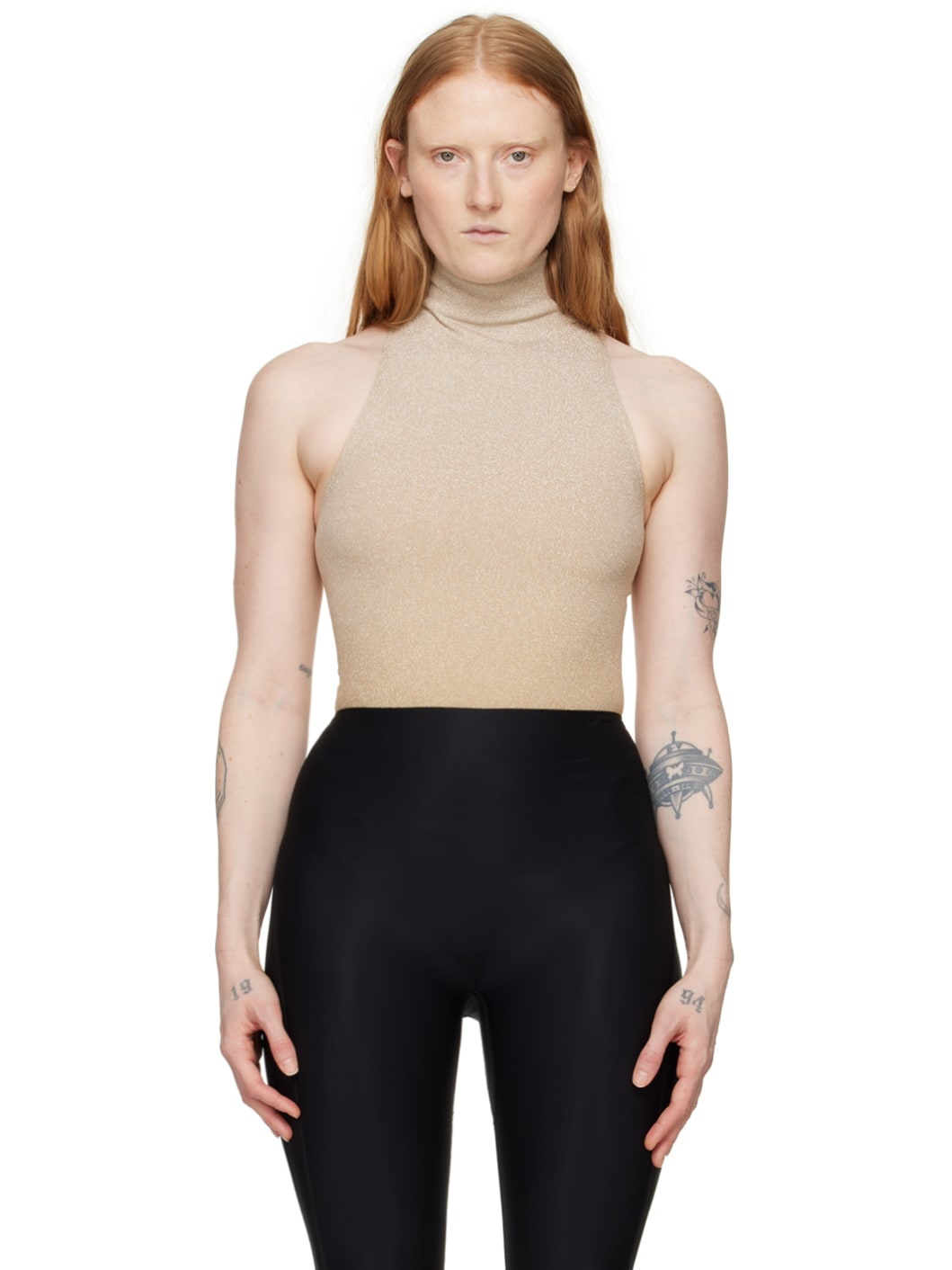 Knit stretch nylon-blend bodysuit. Gradient metallic thread detailing throughout. · Seamless construction · Turtleneck · Press-stud fastening at bottom · Racer back · Partially lined Supplier color: Gold shine 85% polyamide, 10% polyester, 5% elastane. Made in Croatia 241017F358016