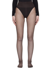 Sheer stretch nylon jersey tights. · 10 denier · Jacquard logo at elasticized waistband · Reinforced toes · Seam at back legs · Partial jersey lining Supplier color: Dark wood 82% polyamide, 18% elastane. Made in Austria 252017F076023
