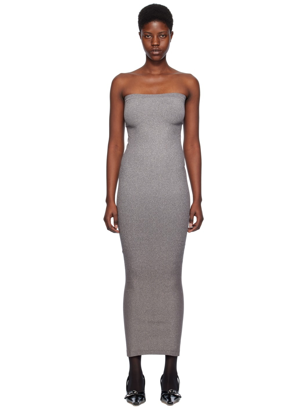 Knit stretch nylon-blend dress. · Metallic thread detailing throughout · Straight neck Supplier color: Titanium 85% polyamide, 10% polyester, 5% elastane. Made in Austria 241017F055002