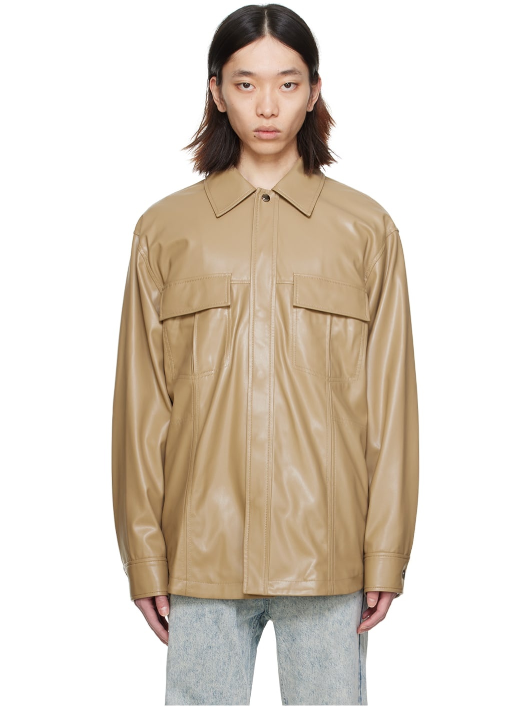 Grained stretch faux-leather shirt. · Paneled construction · Spread collar · Press-stud closure · Flap and seam pockets · Shirttail hem · Press-stud barrel cuffs · Full satin lining Supplier color: Beige Body: 50% polyester, 50% spandex. Lining: 52% viscose, 48% polyester. Made in South Korea 241704M192036