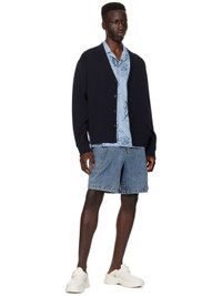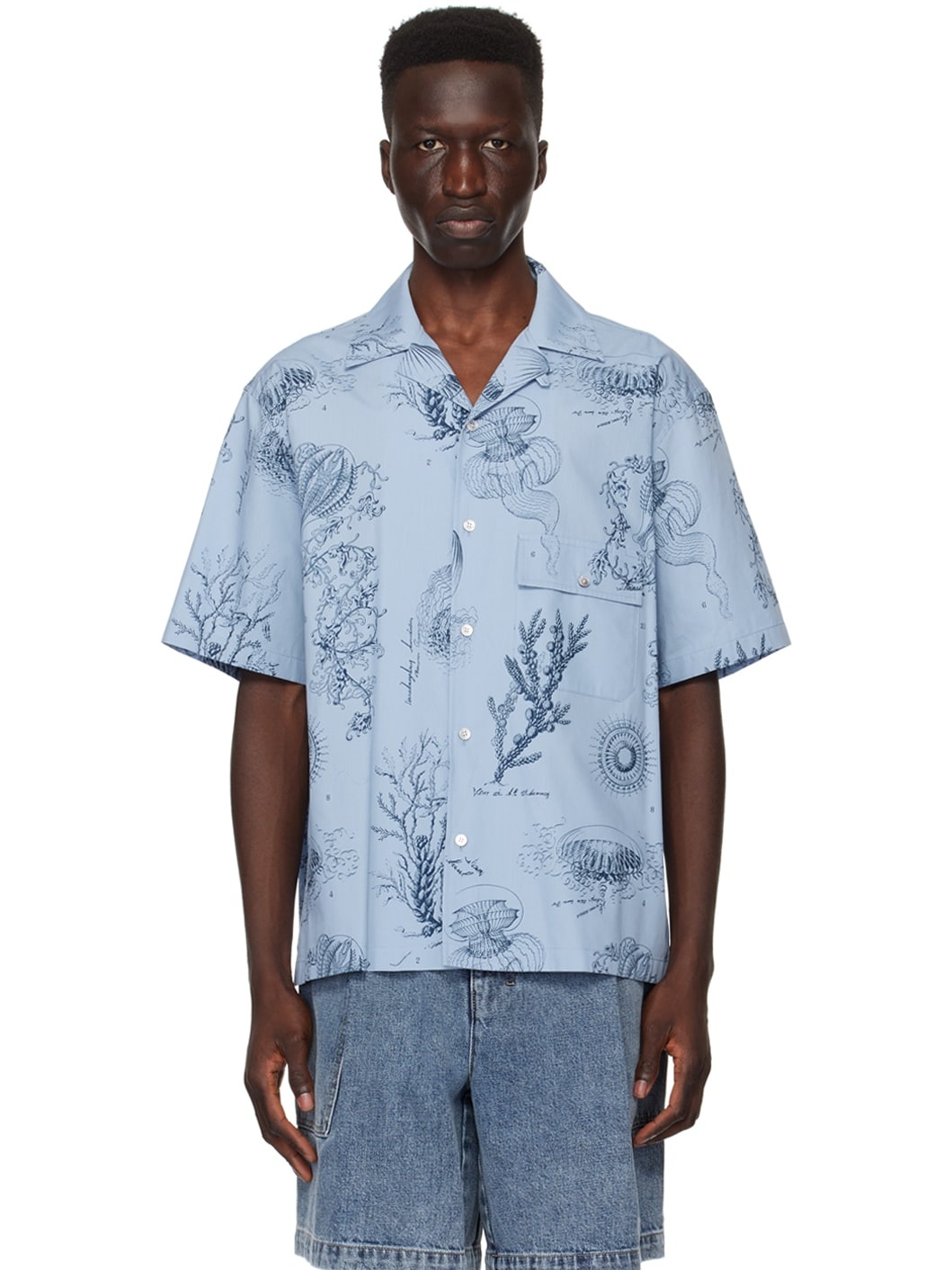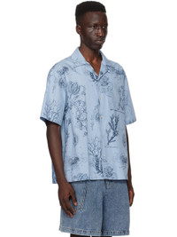 Cotton poplin shirt. Graphics printed throughout. · Open spread collar · Button closure · Flap pocket · Shirttail hem · Logo plaque at back collar Supplier color: Blue 100% cotton. Made in South Korea 241704M192008