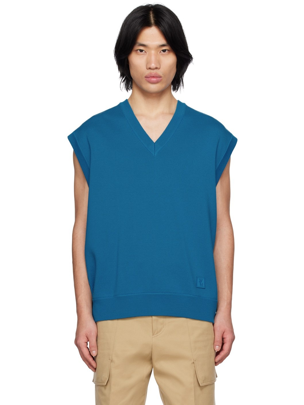 Knit wool vest. · Rib knit V-neck, hem, and armscyes · Embroidered logo patch at front hem · Leather logo patch at back collar Supplier color: Blue 100% wool. Made in South Korea 231704M206001