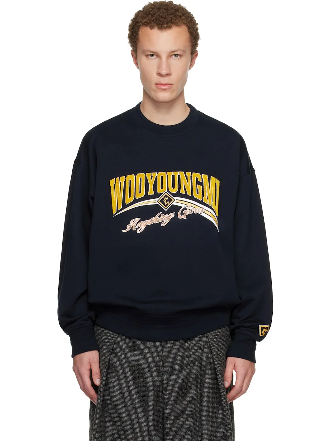 Cotton fleece sweatshirt. · Rib-knit crewneck, hem, and cuffs · Boucle logo patch at chest · Logo graphic and text printed at chest · Dropped shoulders · Logo graphic embroidered at sleeve · Logo hardware at back collar Supplier color: Navy 100% cotton. Made in South Korea 252704M204001