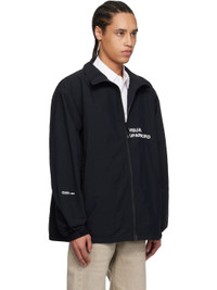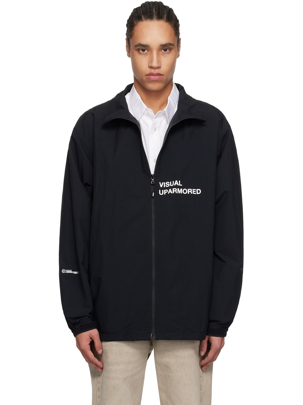 Waterproof PERTEX® UNLIMITED nylon taffeta jacket. · Logo printed at stand collar · Zip closure · Text printed at chest and sleeves · Zip pockets · Concealed bungee-style drawstring at hem · Dropped shoulders · Velcro tab at elasticized cuffs · Logo flag at back collar · Full mesh lining Supplier color: Black Body: 100% nylon. Lining: 100% polyester. Made in Japan 252241M180002