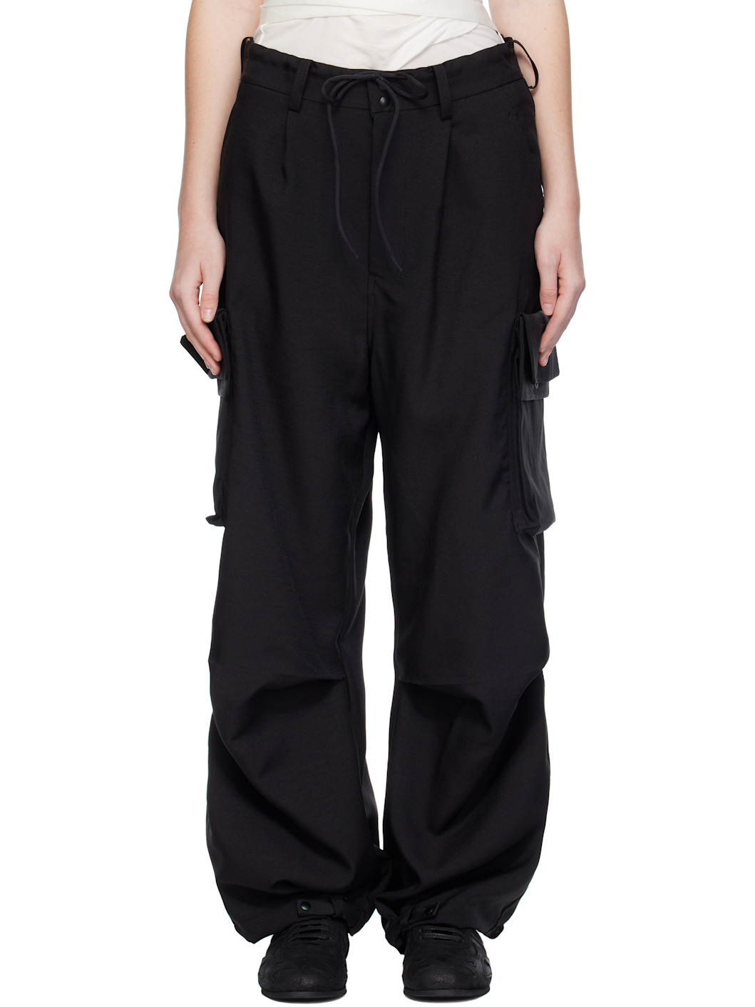 Recycled polyester twill cargo pants. · Drawstring and belt loops at waistband · Four-pocket styling · Zip fly · Pleats at front · Darts at knees · Adjustable press-stud strap at cuffs · Flap and patch pockets at outseams · Logo bonded at pocket Supplier color: Black 100% recycled polyester. Made in Viet Nam 252138F087001