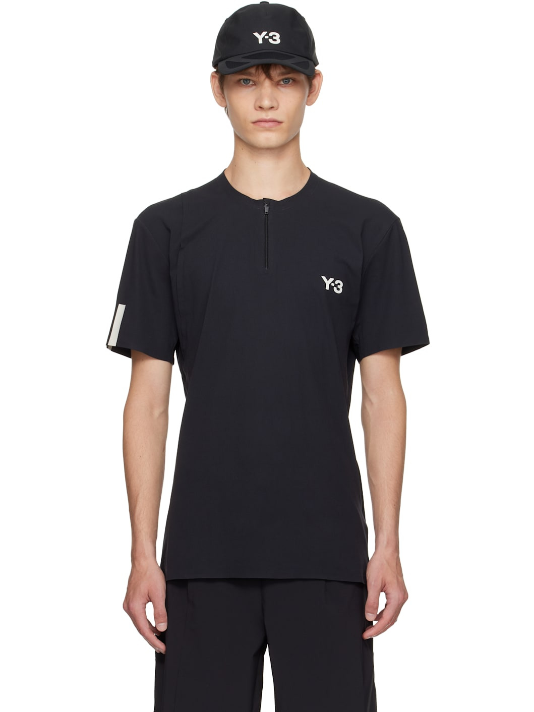 Recycled nylon-blend jersey T-shirt. · Crewneck · Half-zip closure · Bonded logo and exposed seam at chest · Stripes bonded at sleeve Part of the US Open capsule. Supplier color: Black 57% recycled polyamide, 43% polyester. Made in Viet Nam 252138M213000
