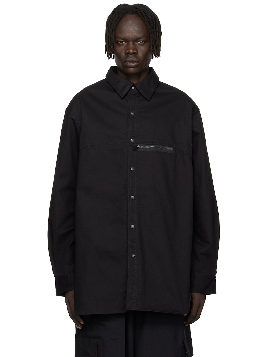 Cotton-blend twill overshirt. · Spread collar · Press-stud closure · Zip pocket at chest · Shirttail hem · Embroidered eyelets at armscyes and back yoke · Adjustable press-stud barrel cuffs · Logo bonded at back yoke Supplier color: Black 85% cotton, 15% hemp. Made in Viet Nam 252138M192011