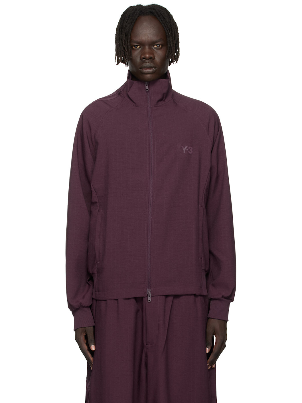 Recycled polyester twill track jacket. · Stand collar · Two-way zip closure · Logo bonded at chest · Zip pockets at front · Rib-knit hem and cuffs · Raglan sleeves · Stripe appliques at sleeve Supplier color: Shadow maroon 100% recycled polyester. Made in Viet Nam 252138M180015