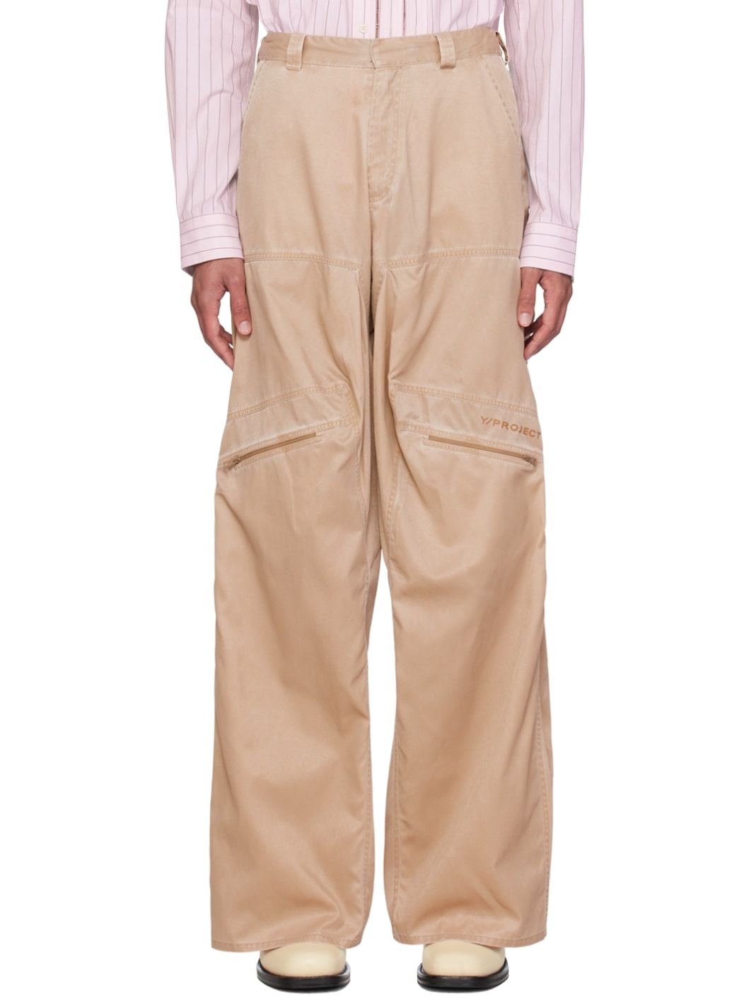 Stretch nylon taffeta trousers. Fading throughout. · Belt loops · Partially elasticized waistband · Four-pocket styling · Zip-fly · Gathering and logo bonded at front · Zip pocket at knees · Partially lined Supplier color: Washed beige 96% polyamide, 4% polyurethane. Made in Poland 241893M191004