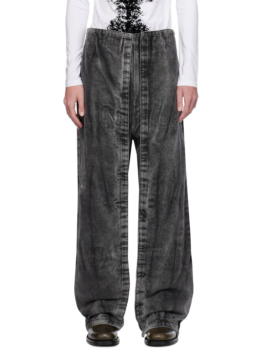 Non-stretch denim jeans. Fading and whiskering throughout. · Belt loops · Five-pocket styling · Zip fly · Detachable velcro panel at legs · Leather patch at back waistband Supplier color: Black vertical whiskers 100% cotton. Made in Portugal 242893M186012