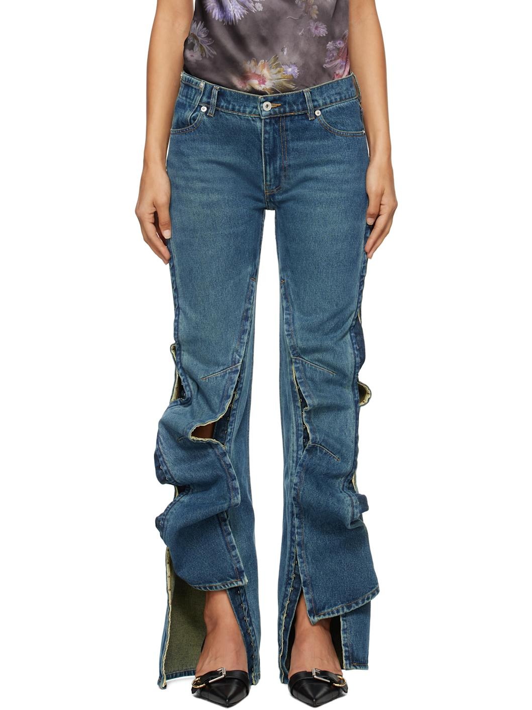 Slim-fit and flared non-stretch denim jeans. Fading throughout. · Low-rise · Belt loops · Five-pocket styling · Zip-fly · Hook-eye vent at inseam and outseams · Leather logo patch at back waistband · Logo-engraved silver-tone hardware · Contrast stitching in tan Part of the Evergreen collection. Supplier color: Evergreen vintage blue 100% cotton. Made in Portugal 242893F069029