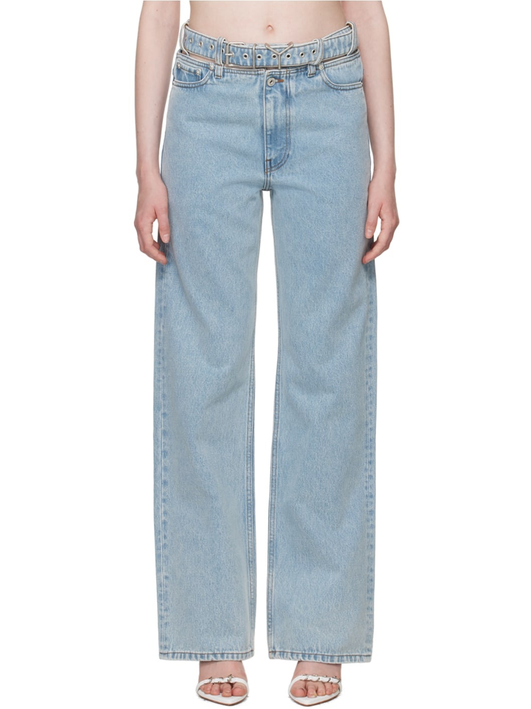 Wide-leg non-stretch organic cotton denim jeans. Fading throughout. · Belt loops · Logo hardware at detachable pin-buckle belt · Five-pocket styling · Zip-fly · Logo patch at back waistband · Contrast stitching in tan Part of the Evergreen collection. Supplier color: Ice blue 100% organic cotton. Made in Portugal 241893F069023