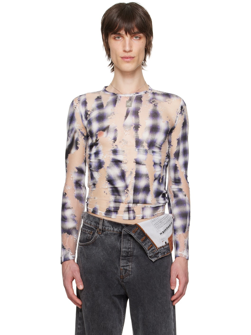 Semi-sheer viscose- and nylon-blend jersey and voile t-shirt. · Check pattern printed throughout · Crewneck Supplier color: Blue print 86% viscose, 14% polyamide. Made in Portugal 241893M213000