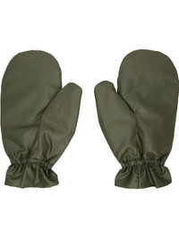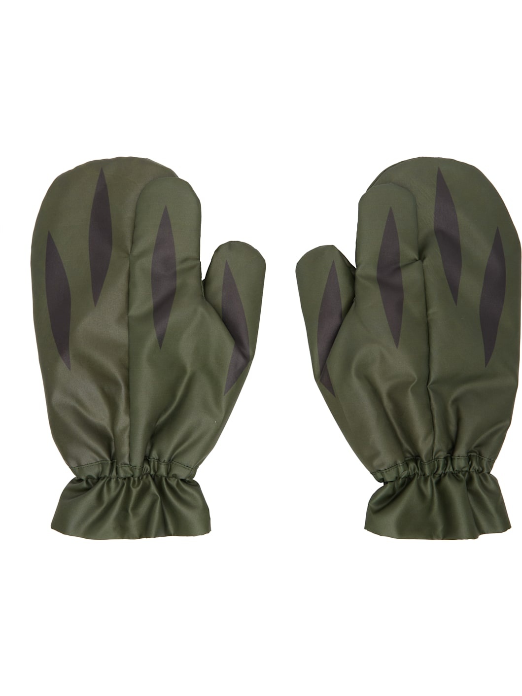 Pair of insulated nylon taffeta mittens in khaki. · Graphic printed at top · Integrated pocket for index finger · Elasticized cuffs · Quilted lining Supplier color: Green Body: 100% nylon. Fill: 100% polyester. Made in United Kingdom 242182M135000