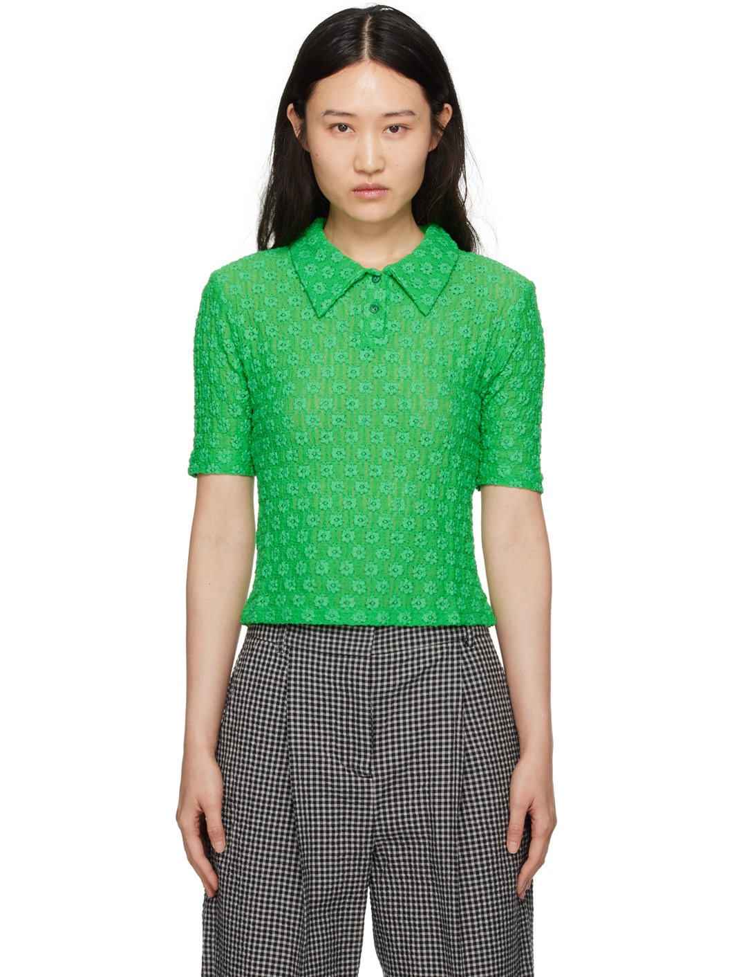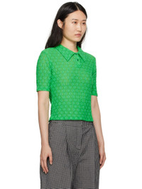 Plain-woven stretch nylon- and cotton-blend polo. Shirring and broderie anglaise detailing throughout. · Spread collar · Two-button placket Supplier color: Green 61% polyamide, 36% cotton, 3% polyurethane. Made in Poland 241161F108008