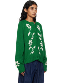 Knit cotton cardigan. · Intarsia floral graphics throughout · Rib-knit crewneck, hem, and cuffs · Button closure · Purl-knit placket · Raglan sleeves · Corozo hardware Available exclusively at SSENSE. Supplier color: Green/Ecru 100% cotton. Made in India 252161F095000