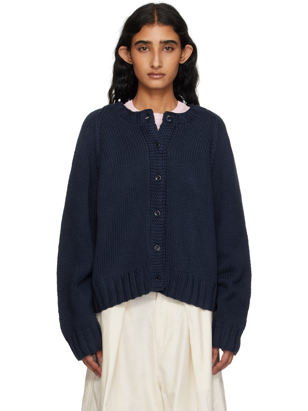 Knit cotton cardigan. · Rib-knit crewneck, hem, and cuffs · Button closure · Purl-knit placket · Raglan sleeves · Corozo hardware Available exclusively at SSENSE. Supplier color: Navy 100% cotton. Made in India 252161F095003