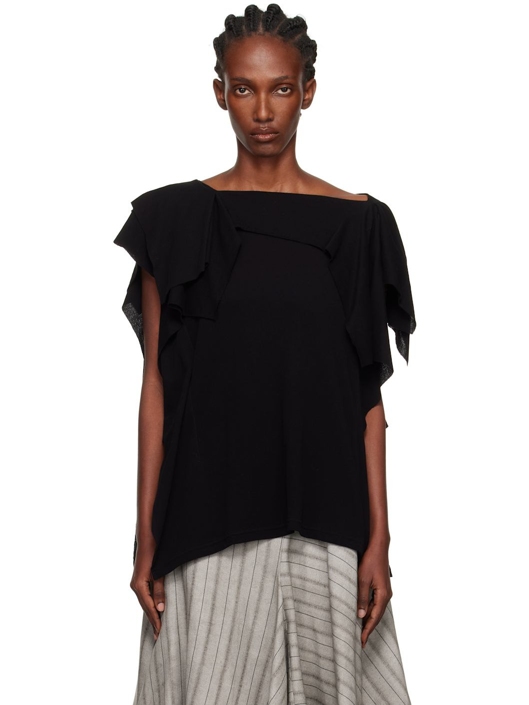 Cotton jersey T-shirt. · Draped and asymmetrical construction · Boatneck · Cap sleeves Supplier color: Black 100% cotton. Made in Japan 251573F110001
