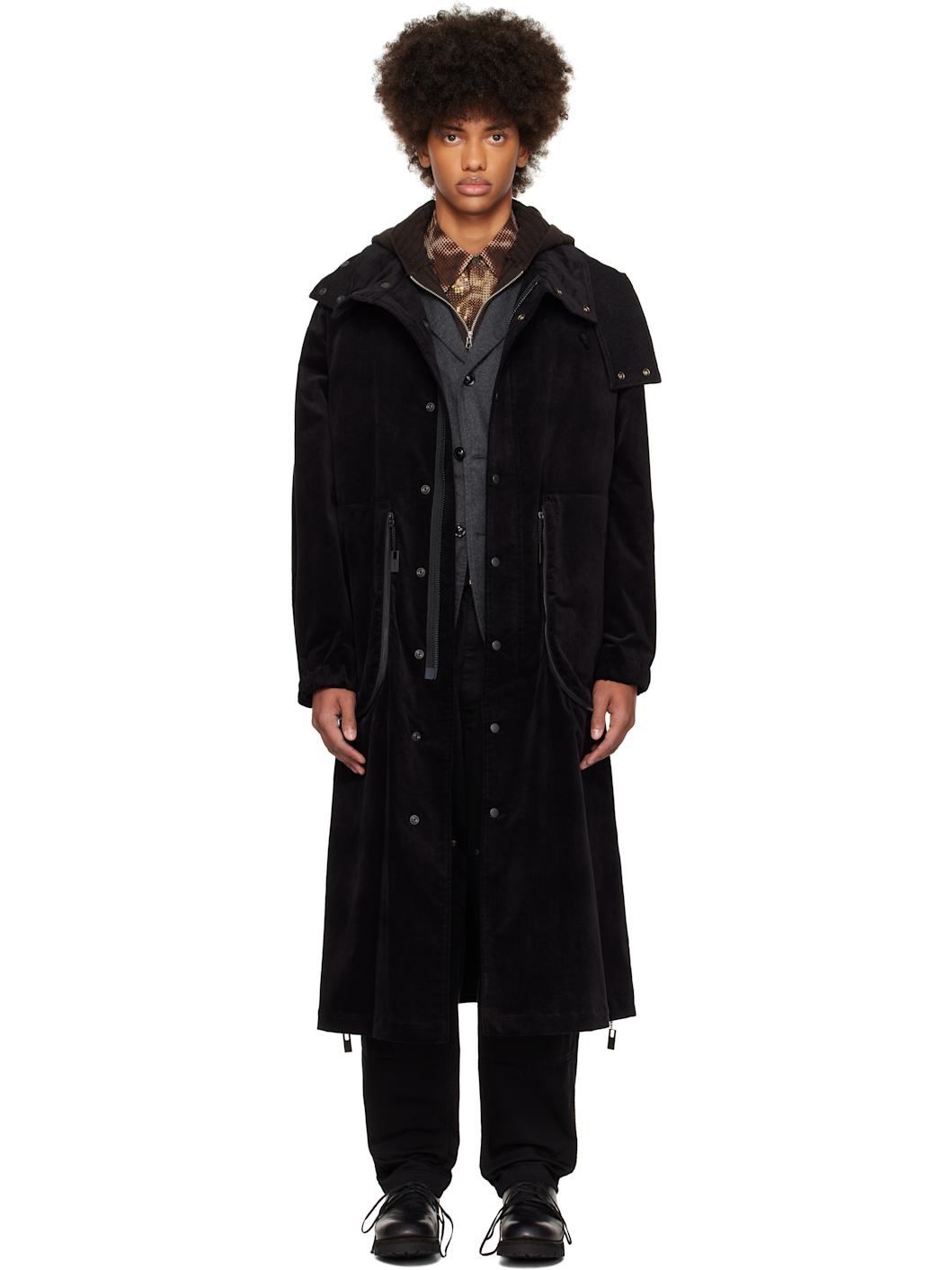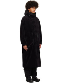 Stretch cotton velvet coat. · Drawstring and press-stud throat guard at detachable hood · Stand collar · Two-way zip closure with press-stud placket · Flap pockets · Zip vents at side hem · Dropped shoulders · Press-stud tab at elasticized cuffs · Welt pockets at interior · Fully lined Part of the Yohji Yamamoto POUR HOMME collection. Supplier color: Black Body: 98% cotton, 2% polyurethane. Trim: 60% wool, 40% cotton. Lining: 100% cupro. Made in Japan 242573M176005